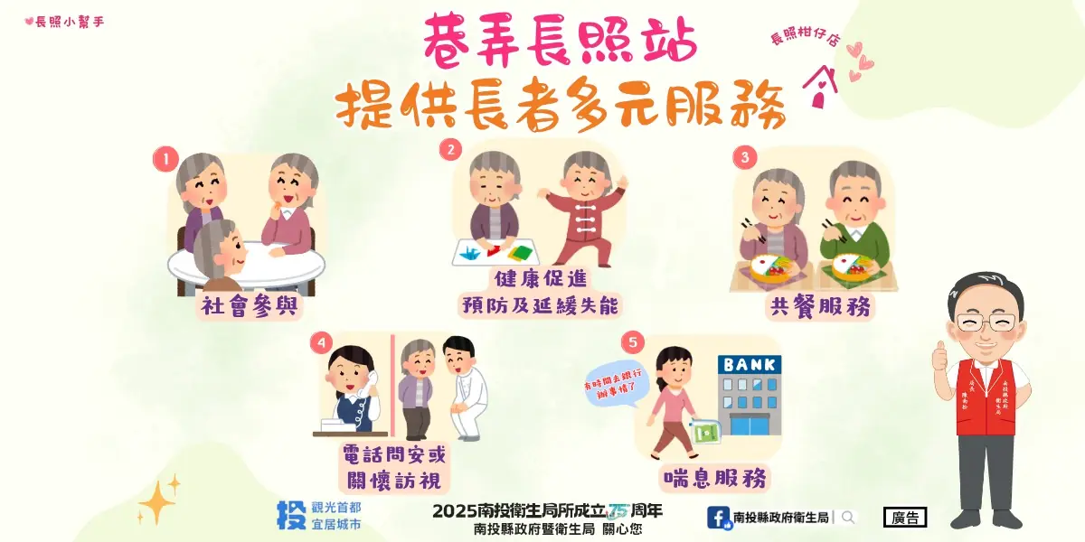隨著高齡化社會的來臨,南投縣的老年人口數量持續增長,長期照護需求日益增加。根據最新統計,南投縣在2024年12月底的65歲以上老年人口已達10萬人,占全縣總人口的約21.7%。本縣截至114年1月已布設176處13鄉鎮巿皆有設置「C級巷弄長照站」,服務人數計18,000人,就近照顧社區中衰弱老人、失能、失智症者,提供每周5天、一天至少6小時的臨托服務、餐飲服務,預防失能延緩失能服務,發揮喘息的功能,促進長者活力老化、縮減長者失能的時間,提升生活品質。