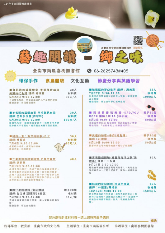 【勁報記者于郁金/臺南報導】喜樹圖書館114年多元閱讀推廣計畫「藝趣閱讀,鄉之味」,自6月22日至10月12日期間,共推出環保手作、食農體驗、文化互動、節慶分享與英語學習等4大主題,共10場活動,即日起陸續開放報名;活動相當豐富有趣,歡迎民眾踴躍報名。