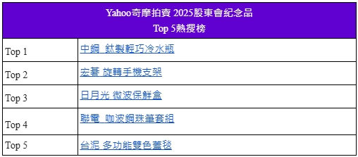 ▲股東會旺季來臨,「股東會紀念品」再掀話題,Yahoo奇摩拍賣觀察平台數據發現「股東會紀念品」關鍵字近期熱搜成長逾7成!連續3年入榜的中鋼今年發送近130萬份「純鈦永續輕巧瓶」,兼具輕量、環保與高顏值亮點,一舉奪下Yahoo奇摩拍賣熱搜冠軍,搜尋量成長逾6倍,拍賣平台轉手價上看2000元;宏碁「旋轉手機支架」則憑藉辦公實用性拿下第2;而聯電再度攜手知名IP「咖波」推出「聯名鋼珠筆套組」可愛外型且多色變化超吸睛,引爆超高網路討論度,奪下熱搜第5,締造連續5年上榜紀錄;日月光「微波保鮮盒」、台泥推出的「多功能雙色蓋毯」等日常隨手小物也入榜;其餘像是富采「黃阿瑪聯名碗」、華南金推出「熊大造型杯」則以可愛萌感成功圈粉。