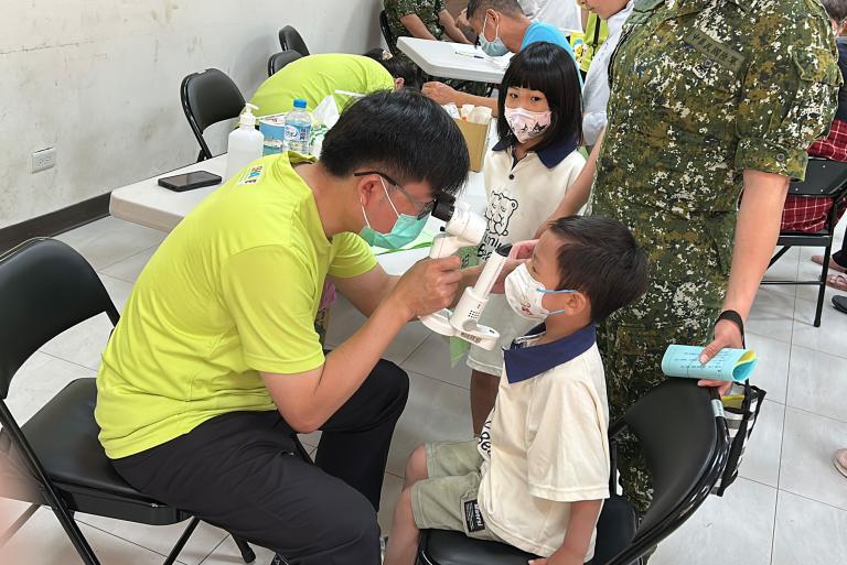 ▲眼科部副主任吳建昇醫師為軍眷子女進行眼睛檢查。(圖╱彰基提供)