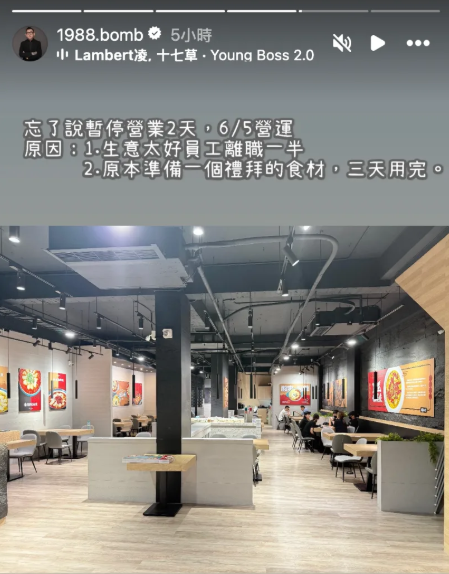 【賴傳媒 王傳文/綜合報導】人氣YouTuber蹦闆斜槓經營多元副業,從精品代購到酒店、建築業樣樣來,近期砸下重金800萬元加盟台中知名酸菜魚品牌,並於6月1日在桃園插旗開幕。不料才營業短短3天,店內竟爆發「離職潮」,超過一半員工請辭,讓他無奈緊急宣布暫時停業,更親自上網公開徵才,盼盡快補齊人力。