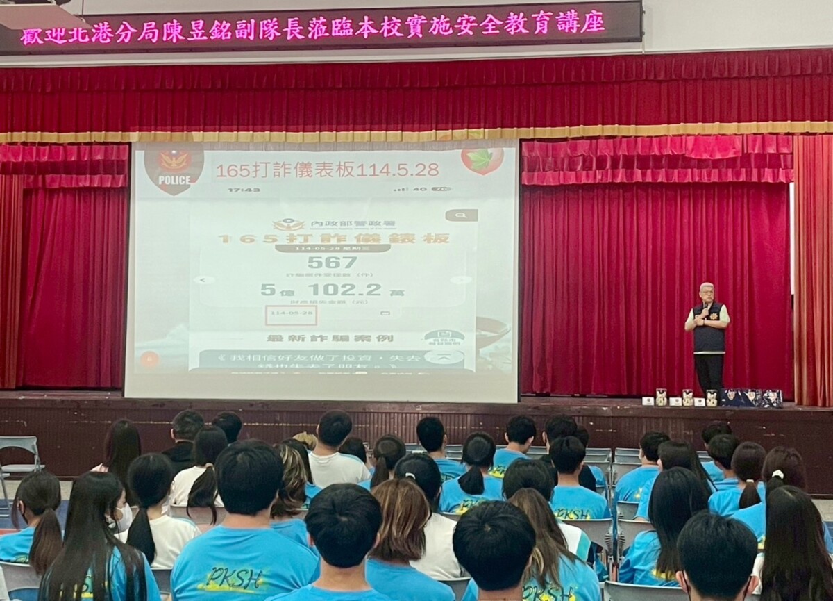 【記者 蘇峯毅/雲林 報導】為提升青少年對詐騙與毒品的防範意識,北港警分局偵查隊副隊長陳昱銘於6月2日應邀率領預防犯罪宣導團成員林玲妤等人,前往國立北港高級中學進行防詐騙與反毒宣導,對象為一年級全體師生。