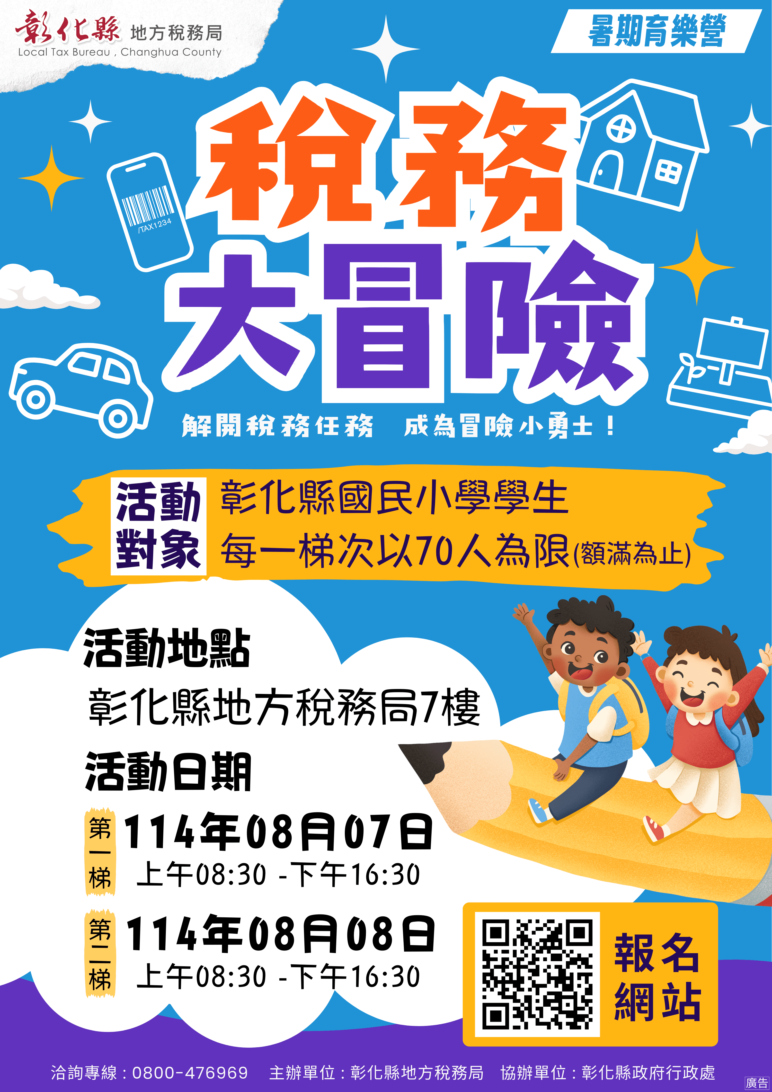 為落實租稅教育向下扎根,彰化縣地方稅務局於暑假期間舉辦114年「稅務大冒險」活動,共2個場次的豐富課程,即日起開放網路報名,歡迎彰化縣國小學生報名,一起參加稅務冒險之旅。