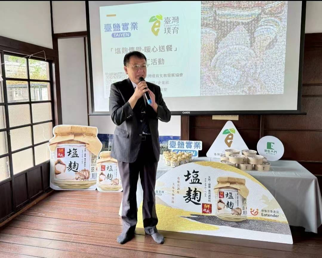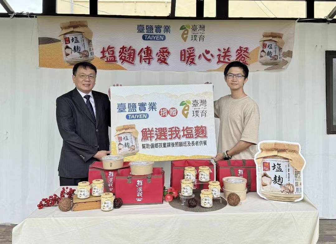 臺鹽公司4日於璞育塾文創園區舉辦捐贈儀式,臺鹽公司董事長丁彥哲捐贈台塩鮮選我塩麴,由璞育文教協會理事長黃雅聖代表受贈。現場另有後壁區公所區長李至彬、後壁區農會總幹事林怡歆、社團法人銀色大門老人福利協會專案經理周明慧、後壁區侯伯里長廖俊斌等人共同關懷當地的長照送餐計畫,打造共好後壁。