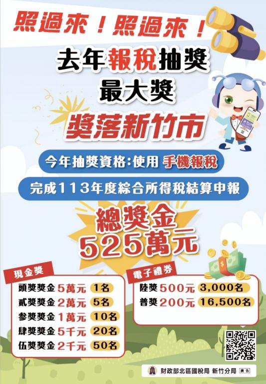 照過來!照過來!去年報稅抽獎最大獎獎落新竹市!財政部北區國稅局新竹分局表示,113年度綜合所得稅結算申報期展延至114年6月30日止,民眾尚未辦理申報可多加利用手機報稅,並搭配行動電話認證機制及新增的快速申報流程、多元繳稅管道及附件上傳功能完成申報,申報全程無紙化,快速、安全又便利;同時還可以參加全國性抽獎活動,總獎額超過5百萬元,頭獎現金5萬元!