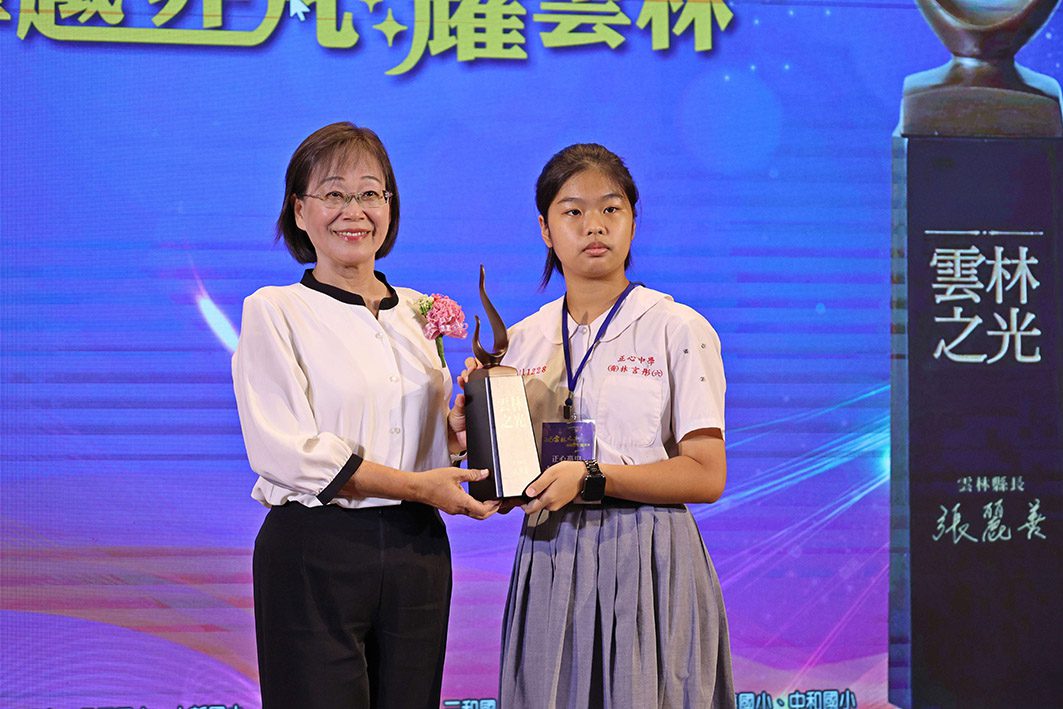 ▲謝淑亞副縣長頒發雲林之光獎座,給榮獲2025總統教育獎的林言彤同學。(圖/雲林縣政府提供)