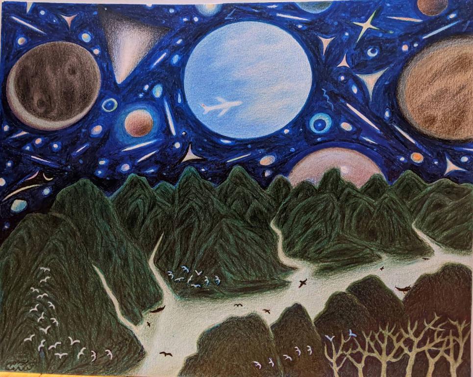 仰望夜空,可見無數星辰。廣闊的宇宙是這些星辰的家,我們的地球只是這個大家庭中的一員,我們是孤獨的嗎?星空之中還有其他生命和文明嗎?其他星球是否有著與地球相似的地形、地貌、海洋和天空?相信這些問題讓很多人著迷。每個星球都是獨一無二的,可能有著與地球不同的山脈、河流,甚至生命和與文明。星空的無數星辰給予我們無窮的想像空間。這樣的起心動念讓鍾復榮開始了一系列星空作品的創作。