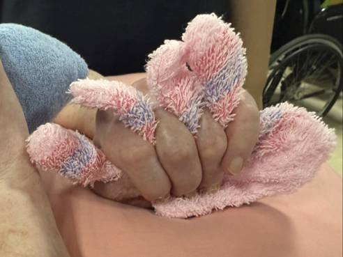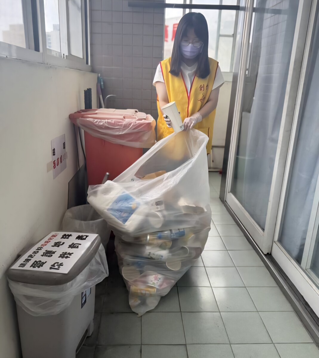在內部永續實踐方面,創世鳳山院落實節能減碳政策,工作人員進出走樓梯,搬移物資才坐電梯;確實做好垃圾分類與資源回收;定時清理冰箱,減少能源浪費。義工團隊將善士捐贈的毛巾或二手衣製作「吸濕手握捲」保持院民手部乾燥,增加舒適感,把資源妥善運用在植物人照護上。也用二手牛仔褲加碎布製作環保手提袋,延續物命、減少塑料;更利用廢紙箱巧手製作發票分尾碼盒。