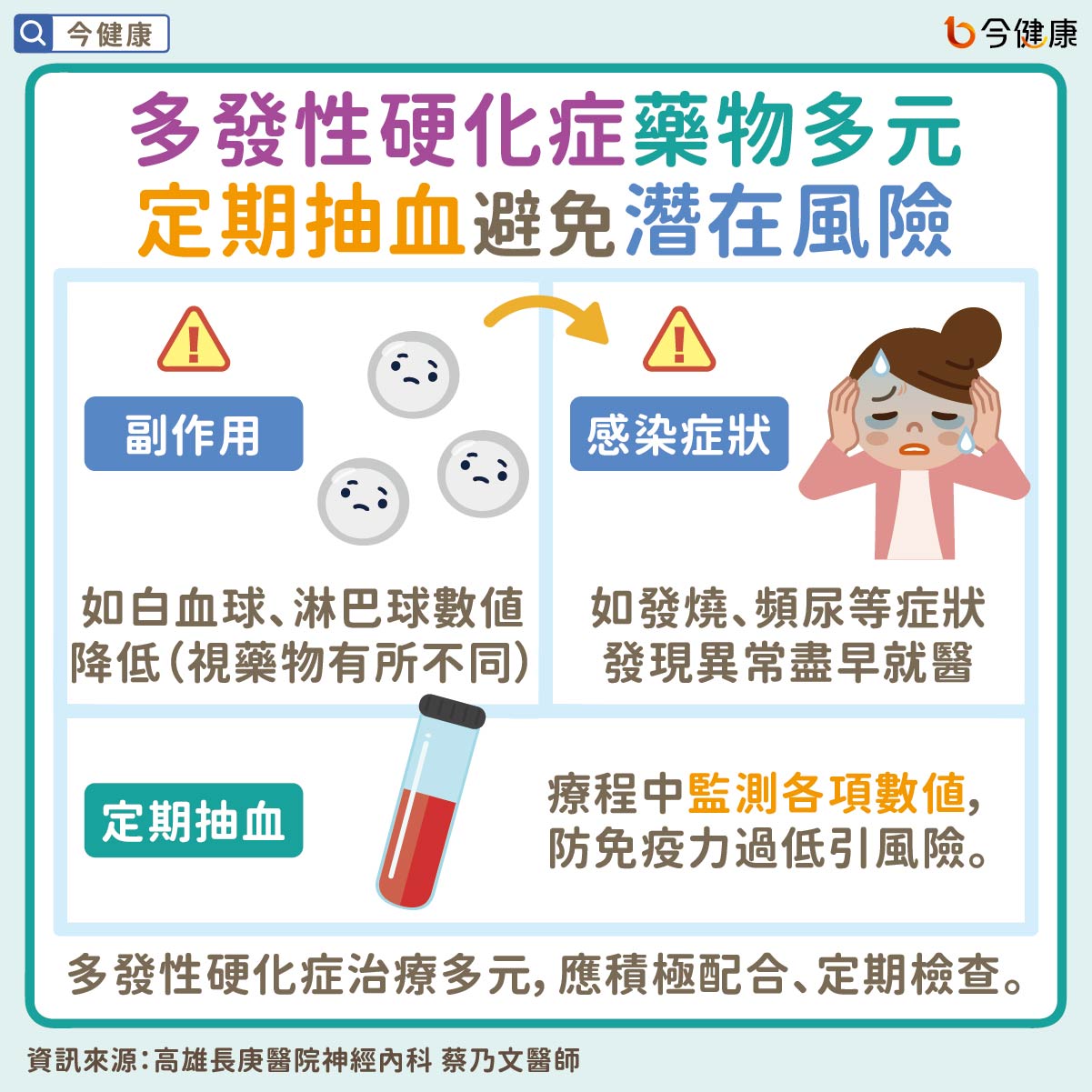 高雄長庚醫院神經內科 蔡乃文醫師指出,多發性硬化症的免疫調節治療(Disease-modifying therapy, DMT)選擇多元,每種藥物的副作用機轉和風險也不太一樣,像是常見的白血球或淋巴球數值降低、肝功能指數上升、感染風險變高等,都是會特別留意的狀況。為了確保用藥安全,醫師通常會建議定期抽血追蹤,看看有沒有這些變化。