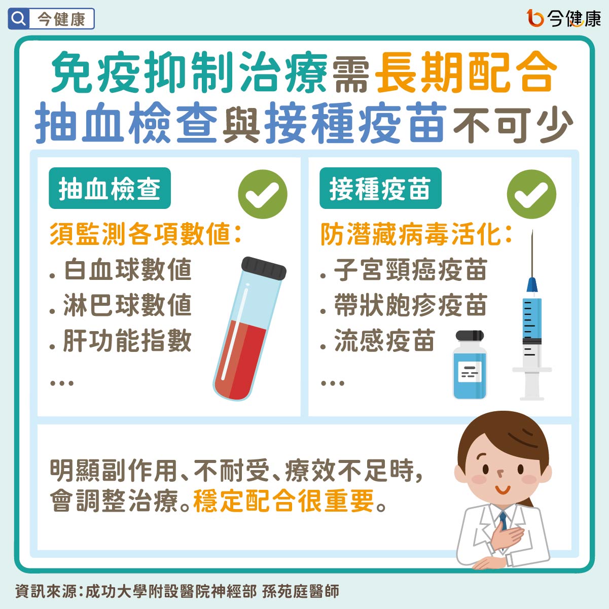免疫抑制治療需長期配合 抽血與接種疫苗不可少