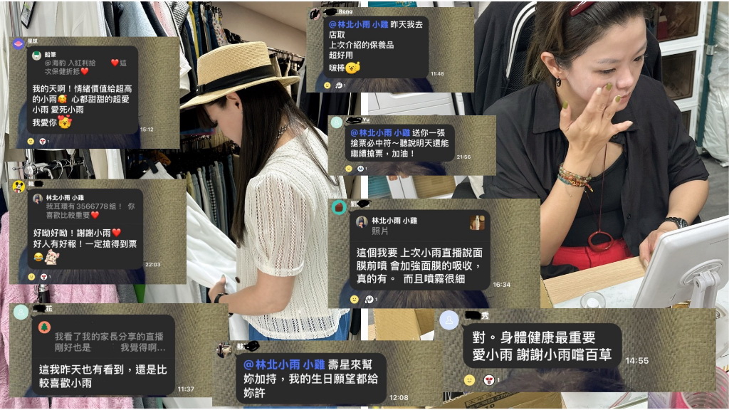 從彰化員林起家的小雨說,「我不是在賣東西,而是在陪伴每一位粉絲變漂亮也變健康」。她直播風格率真幽默,講話直白卻貼心,不吝於依據粉絲風格、身形給出真誠建議。除了服飾,她也推薦自己親身使用的保健食品,許多粉絲信任她的分享,直言「妳吃什麼我就買什麼」。這樣的信任關係來自於她與客人長期的交流與陪伴。她經營的LINE社群,有超過400位粉絲每天互動,彷彿一個溫暖的家庭。有人會主動幫她搶購限量蛋捲,只因知道她喜歡吃,也有人把她當閨蜜般訴說生活瑣事。