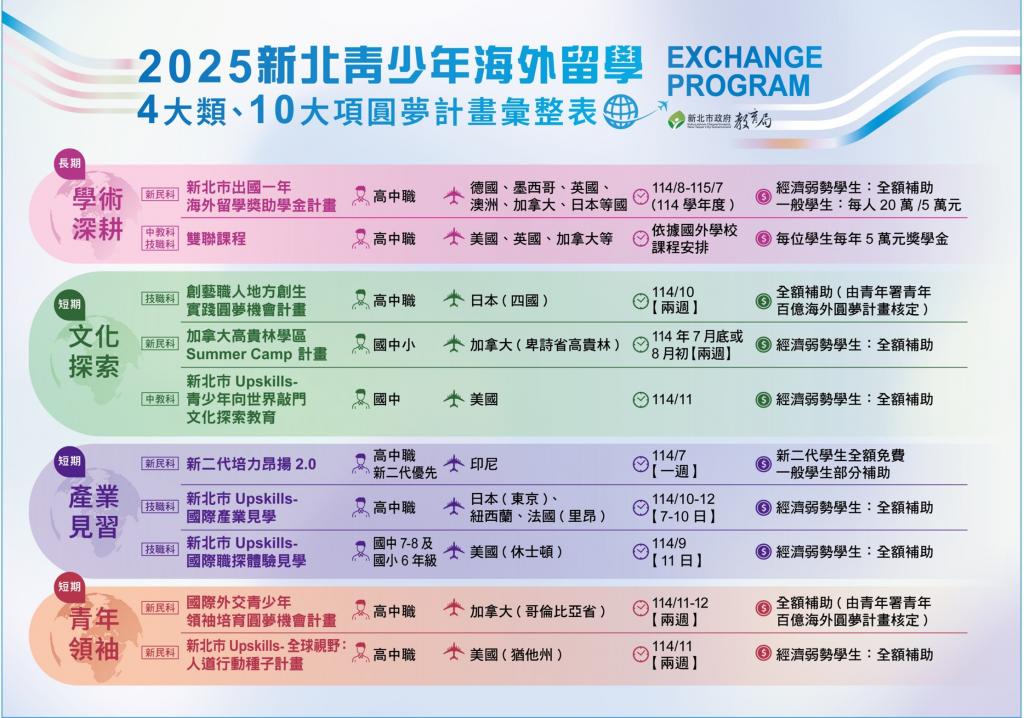 教育局表示,為鼓勵學生前往海外挑戰自我,首度整合各類國際教育資源,推出10項海外留學圓夢計畫,為新北學生量身打造多元國際學習路徑。從長期留學、短期見學到跨國實作與文化交流,將教室延伸至國際舞台,讓每一位學生都能找到屬於自己的「下一站」,勇敢開啟屬於自己的國際旅程。