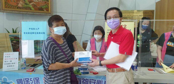 ▲淡水區長巫宗仁(右)親自發送快篩劑給弱勢戶。(圖/新北市社會局提供)