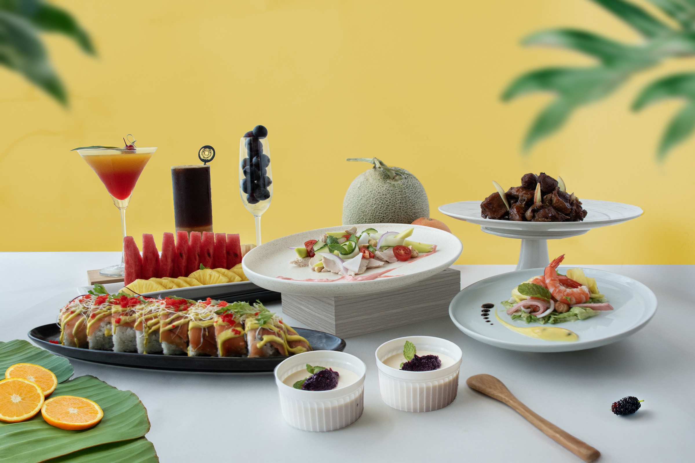 炎炎夏日,主廚團隊精選當季鮮果如鳳梨、芒果、火龍果、酪梨、桑葚等,融入各式佳餚,推出清爽開胃的「盛夏果物季」限定料理。2F咖啡廳自助Buffet繽紛料理推薦:香檸芒果雞柳、摩洛哥杏桃燉羊肉、酸梅燒鴨、哈密瓜帕瑪火腿及紫蘇梅秋刀魚甘露煮等,繽紛水果巧妙入菜,兼具視覺美感與鮮甜風味,清爽開胃,讓人食慾大開。1F大廳酒廊同步推出限定餐點「盛夏水果風味套餐」,內含夏威夷鳳梨蝦仁優格、酸梅燒鴨、每日鮮果湯品、義式奶酪佐桑葚醬等,酸甜爽口、質感升級。另有「夏日特調」系列飲品,如玫荔啡(荔枝玫瑰咖啡)、玉芒醉霓(芒果瑪格麗特)等,還有精釀啤酒買五送一活動,讓旅客大啖在地好味、感受夏日沁涼風情。
