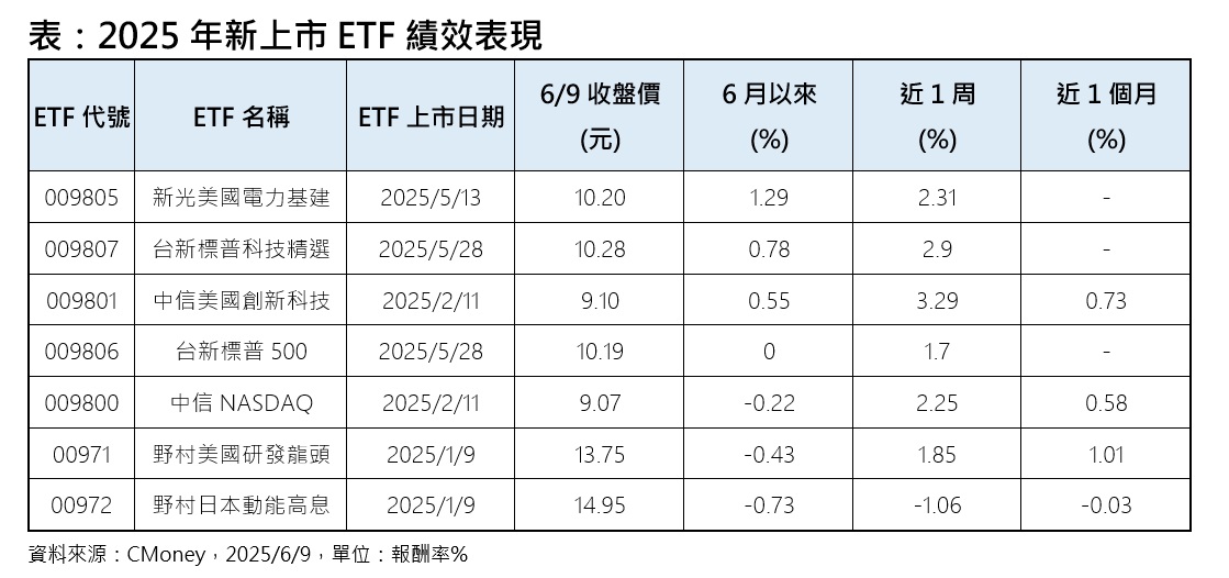 法人表示,第3季關稅戰有望和緩,加上美中在倫敦進行協商,帶動投資氣氛轉趨正面,市場資金重新回到風險性資產淘金,以今年新上市的6檔海外ETF來看,6月以來表現最好的是新光美國電力基建ETF(009805),6月初以來上漲1.29%;台新標普科技精選ETF(009807)與中信美國創新科技ETF(009801),6月以來也維持正報酬。