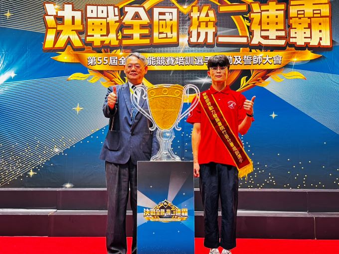 ▲賴家仁分署長(左)與銲接職類選手宋偉騏(右)一起進行決戰全國必勝金盃的啟動儀式。在誓師大會上,桃竹苗分署長賴家仁親自授旗,勉勵選手勇於挑戰自我、全力爭取佳績。並與銲接職類代表宋偉騏共同將象徵勝利的金沙灌入獎盃,寓意選手們將以堅定的意志邁向金牌目標,稱霸全國。活動特別邀請第44屆國際技能競賽冷凍空調職類國手蔡叡鴻現身分享自身參賽經歷與面對壓力的調適心法,鼓勵選手保持專注、發揮實力。非營利組織「SkillS for U」執行長黃偉翔也以「勇往高飛,超越自我」為題進行專題演講,協助選手建立積極心態與賽前心理素質,迎戰即將到來的全國賽。
