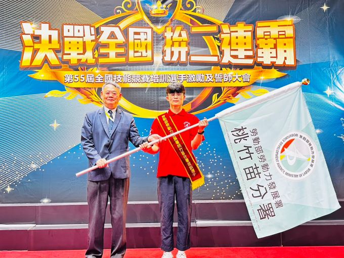 ▲賴家仁分署長(左)在授旗儀式中,將代表勝利的旗幟交由銲接職類選手宋偉騏(右)。桃竹苗分署分署長賴家仁表示,透過技能競賽不僅能促進青年選手交流與切磋,也激發他們挑戰自我、精進技藝的熱忱;桃竹苗分署多年來積極推動技能扎根,深入轄區國、高中學校,舉辦國手入校宣講、職業體驗及多場技能競賽推廣活動,提升學生對技職的認識與興趣,自106年至114年間,該項技能推廣巡迴列車已服務超過8000人次,成效卓著。此外,分署與多所學校密切合作,挖掘並培訓優秀技能好手,投入資源助其發展,進一步推動選手參加全國及國際賽事,提升台灣技能水準與國際能見度。