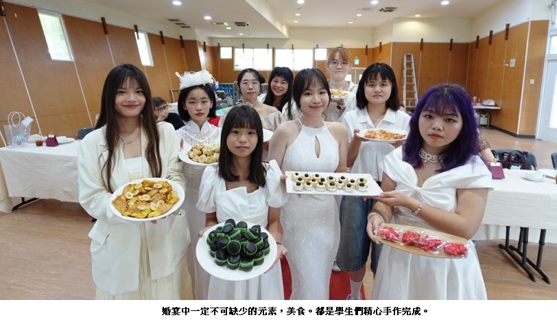 婚宴布置以象徵純潔白色為主,是師生們整個學期投入的心血結晶。從主題發想、佈置設計、菜單規劃、餐點與飲品實作,到婚禮小物、永生花禮品製作,再到整場活動流程的情境鋪陳,學生們在每一個細節中都傾注無比的熱情與創意。指導老師李易穎本身來自飯店經營家庭的背景,學期中安排前往家族經營的麗尊酒店進行校外教學,邀請飯店婚宴主管親自分享實務經驗,讓學生能深刻掌握婚禮實務的專業細節,也讓這場展演多了一份真實與溫度。