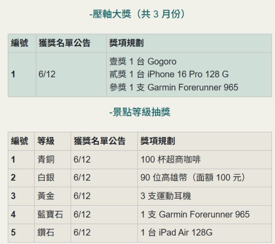 ▲走跑高雄2.0景點及壓軸大獎獎項。活動設計不只鼓勵挑戰景點任務,也提供所有參與者公平抽獎機會,壓軸大獎包括Garmin高階運動錶、iPhone 16 Pro及Gogoro電動機車。3位中獎民眾皆為規律運動者,從日常散步到6分速跑者皆有,展現出「日常累積、人人有機會」的活動精神。
