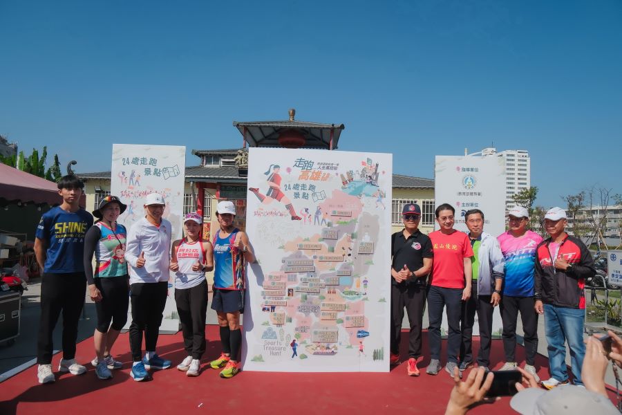 ▲跑團代表共同拼出24個熱門景點地圖。運發局表示,活動將延長至今年底,抽獎券會重新累積計算,並於每月加碼抽出百位幸運民眾贈送超商電子禮券,鼓勵更多市民將運動融入生活,達成健康與獎勵雙贏。