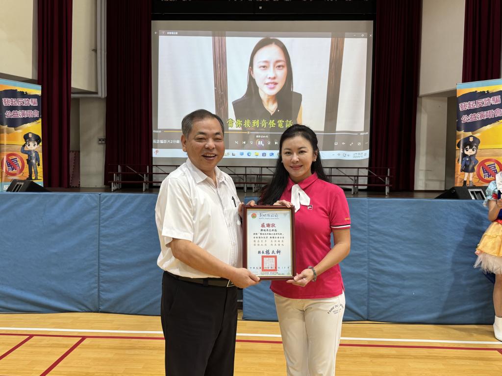 ▲新竹縣東興國小今(6/12)日上午舉辦「藝起反詐騙公益演唱會」,副縣長陳見賢頒感謝狀給東興國小家長會長曾逸君。(圖/竹縣府提供)