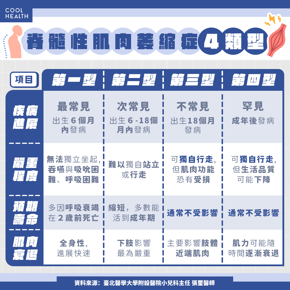 臺北醫學大學附設醫院小兒科主任張璽醫師受訪表示,SMA在臨床表現依型別而異,嚴重程度差異甚大。第四型SMA較為罕見,通常在成年後才發病,症狀進展緩慢,主要表現為肌肉無力,對呼吸功能影響較小,但患者的肌力仍可能隨時間逐漸衰退。