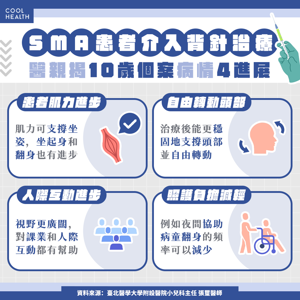 張璽醫師說明,目前台灣核准使用的SMA藥物涵蓋三種治療機制,包括脊髓腔注射的「背針」治療、口服藥物與基因療法。這些治療皆著眼於提升SMN蛋白的表現,以延緩疾病惡化,甚至改善運動能力。