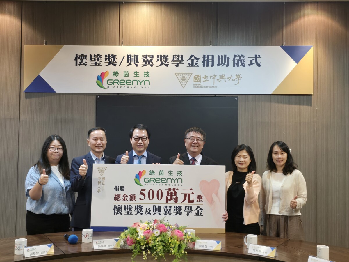 綠茵生技董事長吳嘉峰表示,今天的成就來自許多貴人相助與興大的培育,很榮幸能有為母校貢獻心力,透過支持母校懷璧獎及興翼獎學金,希望能為更多學弟妹與年輕學者創造發展的機會,讓他們專注學習、勇敢追夢。未來也將持續發揮「利他」精神,將這份助力延續下去,形成良善循環。