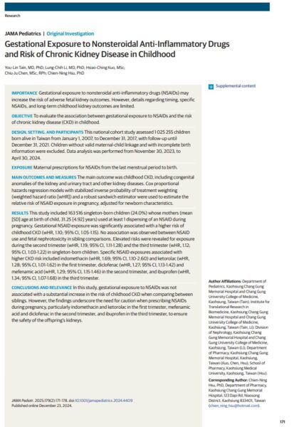 高雄長庚研究團隊分析超過百萬名台灣兒童的健康資料,結果顯示:孕期至少使用過一次NSAID的媽媽,她們的孩子在未來罹患慢性腎臟病的風險提高了10%。尤其是第二孕期(懷孕第13-26週)或第三孕期(懷孕第27週至分娩)使用NSAID的風險更高,特別是第三孕期使用屬於常見指示藥的ibuprofen(布洛芬),風險將提升至34%。這研究結果已發表在2025年國際醫學期刊《JAMA Pediatrics》,並引起了國際社會的高度關注。該研究迅速被翻譯成多種語言並在國際媒體和社交平台上廣泛傳播。