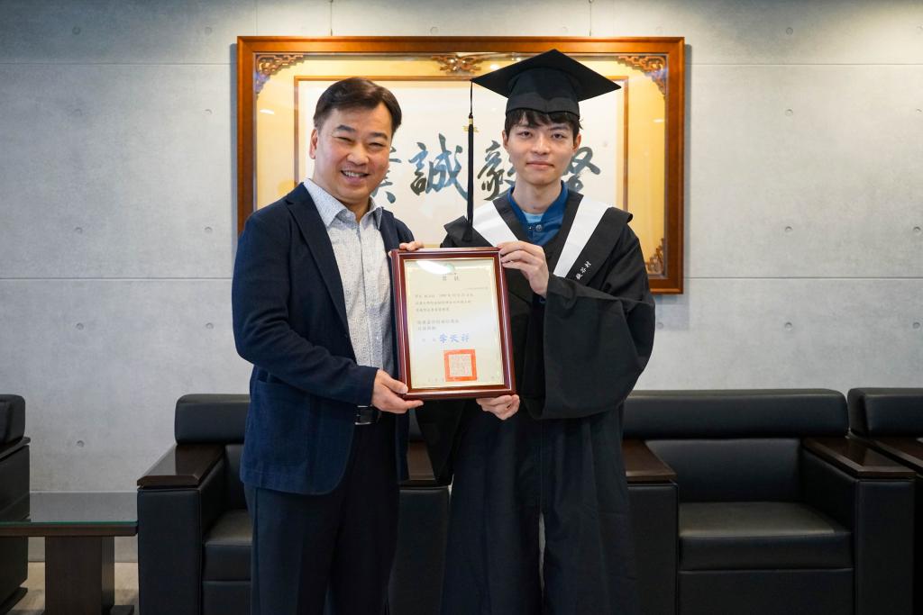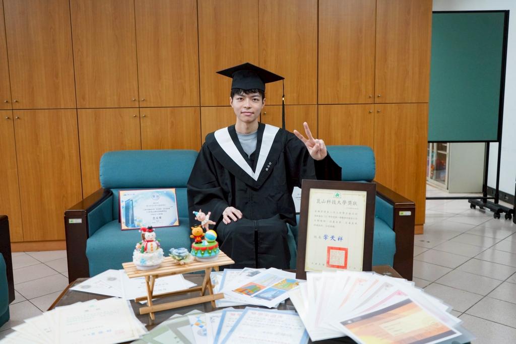 【勁報記者于郁金/臺南報導】 不怕出身低,只怕沒志氣,今年從崑山科技大學金融管理系畢業錢谷村,自小家境清寒,更有胸骨凹陷與脛骨異常狀況,打工自籌醫療手術費,然而他奮發向學,從餐飲跨域學習,大學雙主修金融系及視傳系,考取12張專業證照、參與競賽及實習累積實作經驗,優異表現讓他在學期間屢次獲頒獎學金,更一舉錄取6間研究所,畢業之際再獲校方頒發傑出專業榮譽獎,他一步步努力,為自己開拓新人生道路。
