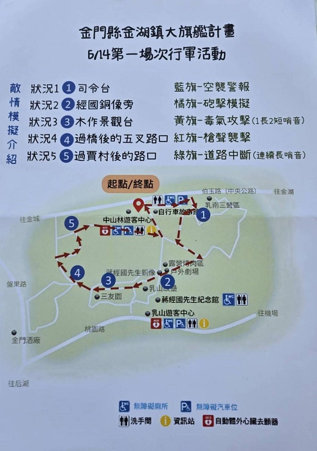 ▲大旗艦行軍召集令,行軍中。金門曾經歷戰爭,爰早期大多數村落均有國軍駐軍,後續撤軍後留下的碉堡、營區成為金門島上特殊的戰地風情,演習、行軍亦是多數居民的回憶,為了讓社區居民回味昔日戰地風情,大旗艦計畫特別規劃了一年2次行軍活動。本次行軍召集令於中山紀念林石頭牌前誓師出發,行軍過程伴隨軍歌及口號,並設計5個敵情模擬,由各社區分別主責辦理,包含情境一:空襲警報(播放警報聲音,模擬敵機臨空,全員就地臥倒、掩蔽、靜音)、情境二:砲擊摸擬(播放爆炸音效,模擬敵砲射擊,全員分散臥倒、躲避、尋找遮蔽物)、情境三:毒氣攻擊(以哨音與旗幟提示毒氣區,模擬敵方釋放毒氣,全員用毛巾遮口鼻、迅速撤離)、情境四:小部隊襲擊(播放槍聲及隠藏觀察哨,模擬發現可疑狙擊點,全員快速通過、低姿通行)及情境五:道路中斷(以哨音、旗號及路障,模擬道路被炸毀,全員探索替代路線、通知指揮),內容生動精彩,讓各參與社區民眾有不同的體驗與合作經歷。