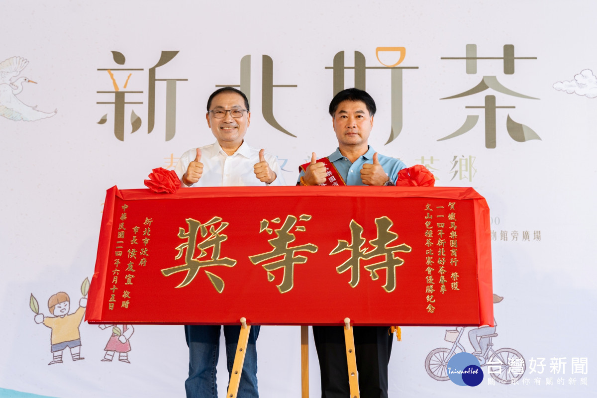 新北市長侯友宜今(15)日出席新北農創所開幕及新北好茶展售會,宣告新北市首座農創所正式啟用,同時頒發賀匾予春茶評鑑特等獎得主方均銓。為慶祝春茶上市及據點開幕,6月21、22日於坪林茶業博物館旁廣場展售會及「有種茶 UChung」皆推出限時優惠,邀請民眾至坪林一同體驗新北好茶創新滋味。