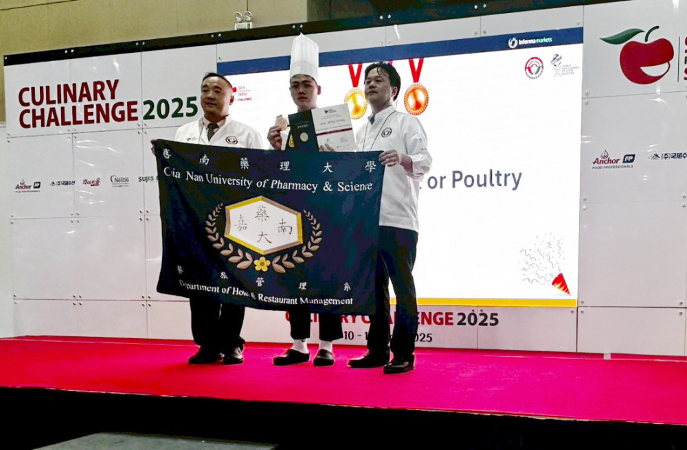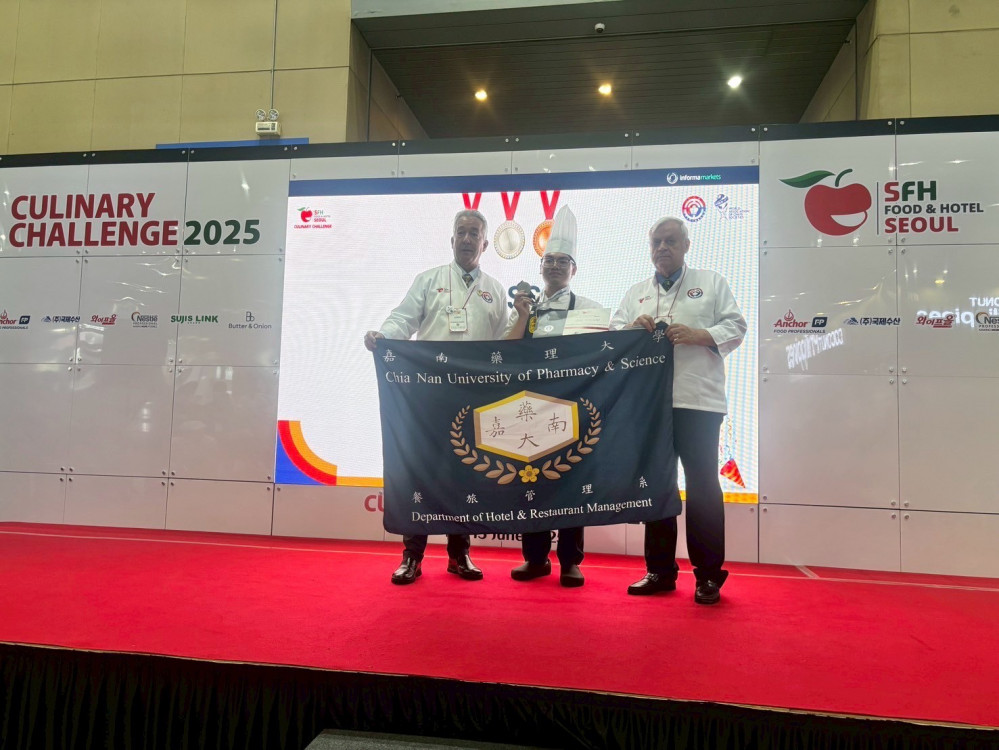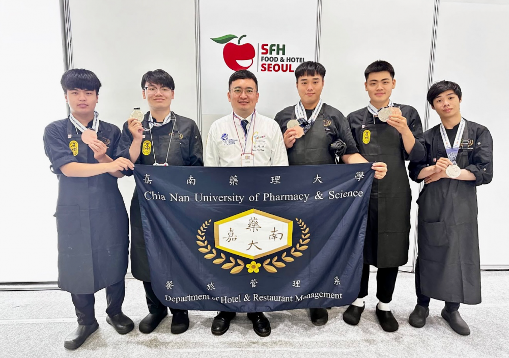 【大成報記者杜忠聰/臺南報導】嘉南藥理大學餐旅管理系西餐廚藝隊再度傳來捷報!由指導老師曾楷勛帶領下,李旻豪、張冠傑、郭俊佑、孫明琮與明韋辰於6月中旬前往韓國,參加「2025首爾國際廚藝挑戰賽(Seoul International Culinary Challenge)」勇奪三銀、四銅與八項佳作,為校爭光。