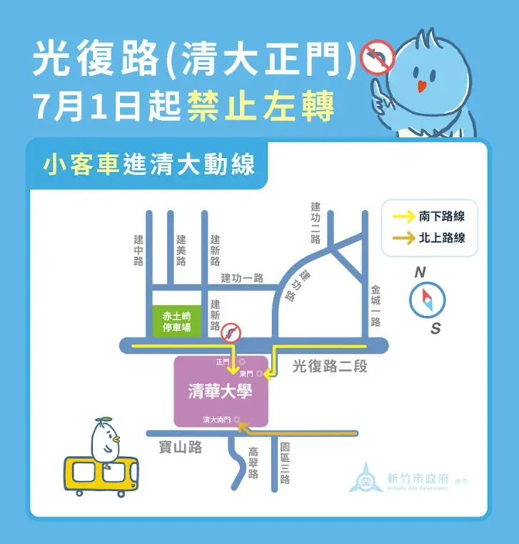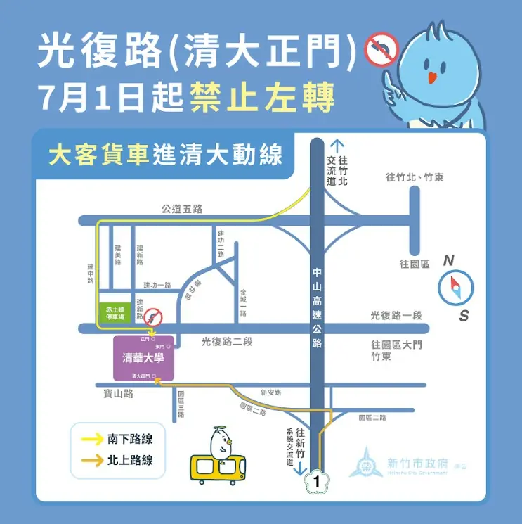 交通處表示,自7月1日起實施「光復路與清華大學校門口(往市區方向)禁止左轉」,進入清大車輛可多加利用建功路左轉附加車道及專用時相進入校園,或提前改駛其他替代路線進入校園,維護行車安全。國道南下前往清大車輛,可提前由新竹交流道公道五路南向出口經建中路或水源街進入光復路,再右轉進入清大北門;國道北上車輛可提前由園區交流道經寶山路右轉進入清大南門。