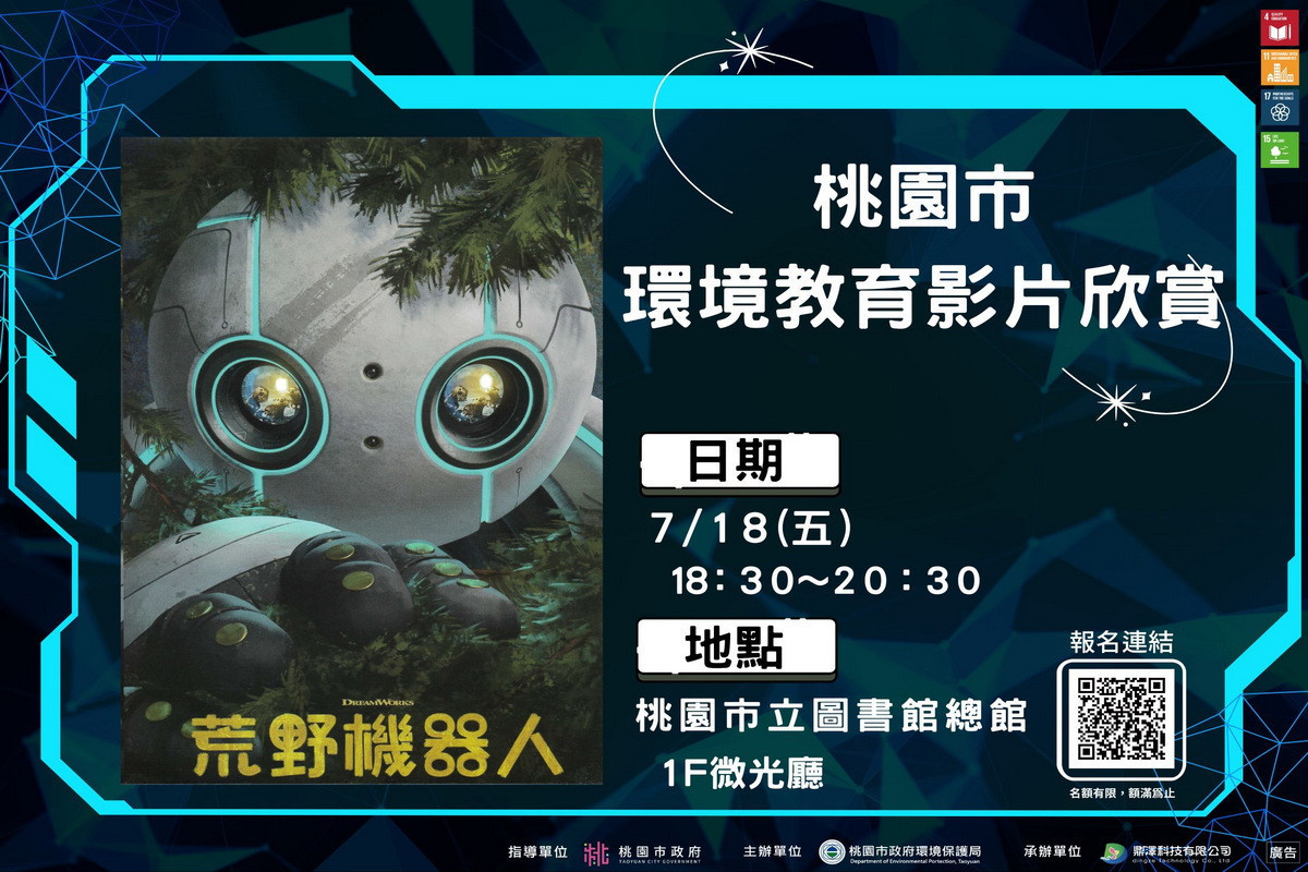 為推廣環境教育、提升學童環保意識,並喚起市民對自然永續的關注,桃園市政府環保局將於7月18日(星期五)晚間,在桃園市立圖書館總館1樓「微光廳」,首度舉辦「桃園市環境教育影片欣賞」活動。當天將放映改編自全球暢銷繪本的動畫電影「荒野機器人 The Wild Robot」,透過動人故事,引導觀眾思考棲地破壞、生態失衡與環境倫理等議題。活動自6月23日起開放線上報名(網址:https://reurl.cc/VYqQZQ),名額有限,額滿為止,歡迎市民朋友踴躍參加。