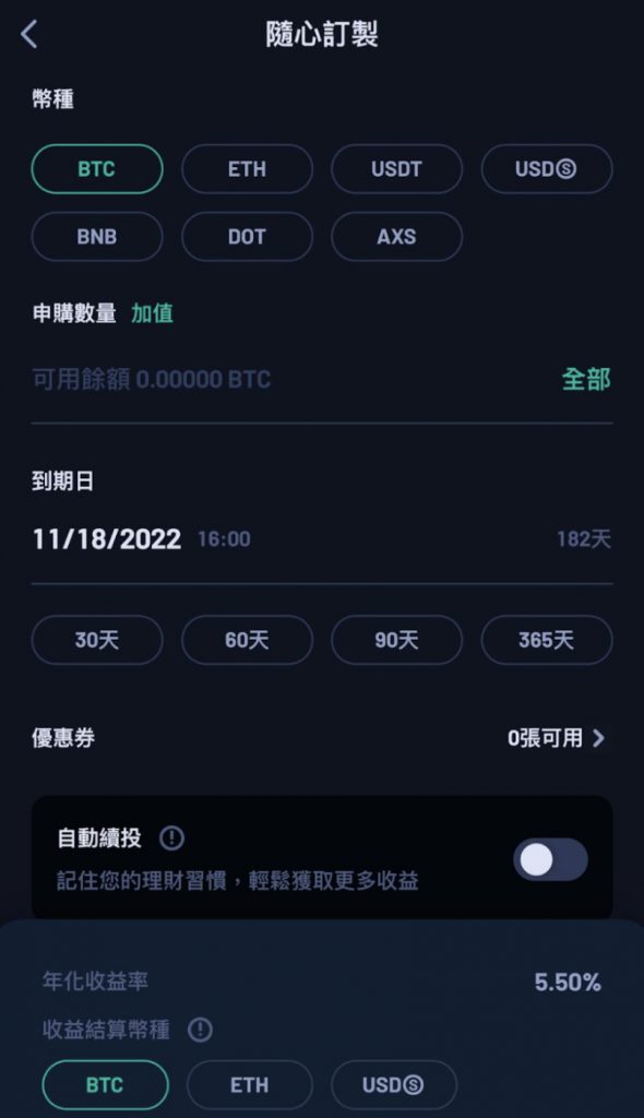 John 也觀察到台灣投資者最喜歡使用的產品是「定存」、「定投」這樣的理財產品:「我知道有很多的比特幣、以太幣忠貞信仰者,那最好的長期持有策略,就是定存與定投。」WhaleFin 供應多個加密貨幣的定存產品 (BTC/ETH/USDT/USDⓈ/BNB等),與其他平台不同之處在於,用戶可以自定義「存入數量 (最低至一美元價值)」、「定存週期 (30/60/90/365天)」,甚至能自定義結算幣種「BTC/ETH/USDⓈ」,再給予不同的年化報酬,自由度相當大。