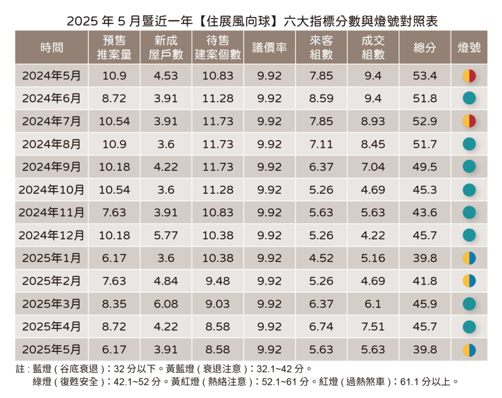 代表北台灣新建案市場概況的「住展風向球」,今年在3月與4月回升穩定綠燈後,5月燈號再次降為代表衰退的黃藍燈,分數是39.8分,六大構成項目呈現「四降、二平」,預售屋推案量、新成屋戶數、成交組數、來客組數下滑,待售建案數、議價率分數持平。
