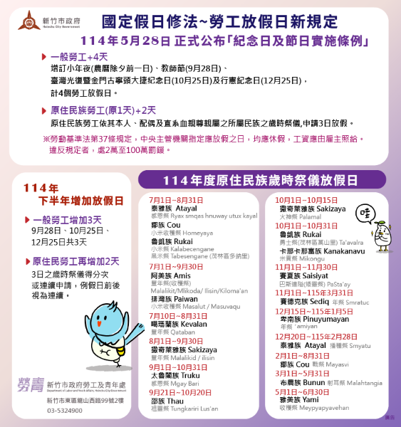 勞青處補充,依《勞動基準法》第37條規定,內政部公告的紀念日、節日、勞動節及中央主管機關指定的放假日均屬應休假日,雇主應依法給假並照給工資,「原住民族歲時祭儀」屬法定假日之一,應受到同等重視與保障,若勞工朋友遇到相關權益爭議,歡迎致電新竹市政府勞工及青年處03-5324900洽詢,市府將持續陪伴每一位勞工,攜手打造更友善、更幸福的勞動環境。