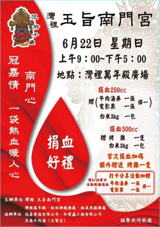 這次捐血活動於22日上午9時起至下午5時,在灣裡萬年殿廣場前舉行,民眾捐血250cc即贈文賢店其森牛肉湯提供的牛肉湯券1張,或電影票1張(兩者擇一),以及白米3公斤1包;加碼捐500cc即贈烤雞1隻,以及白米3公斤1包。