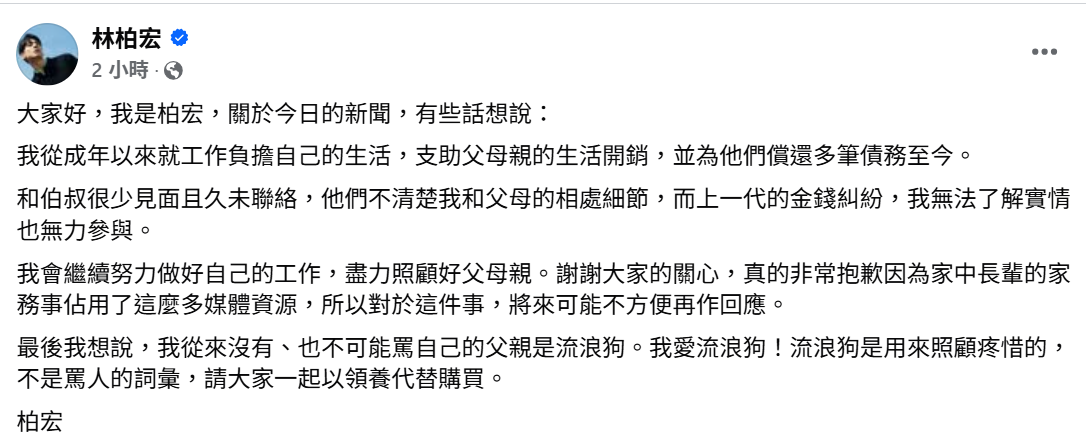 林柏宏在聲明中表示,自成年以來便獨立負擔生活所需,同時長期協助父母親生活開銷,甚至曾幫忙償還債務。他坦言,對於家中長輩之間的金錢糾紛並不了解,也無從介入,但仍感謝社會大眾的理解與支持。