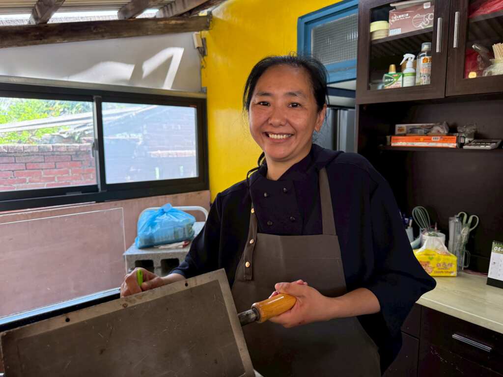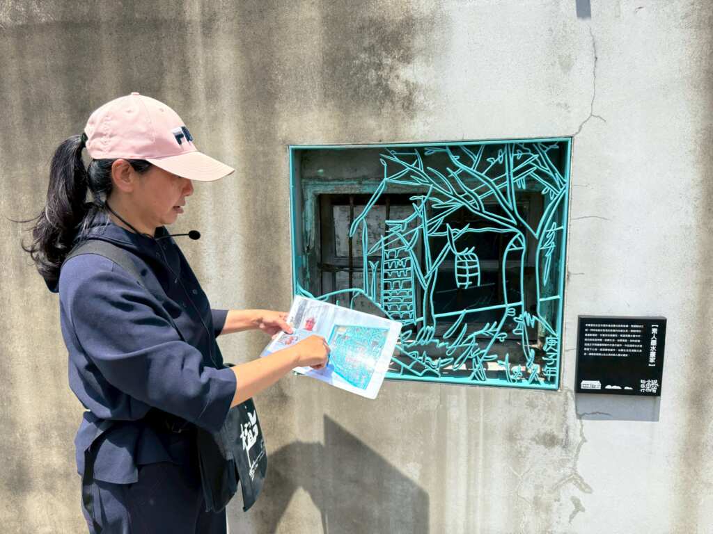 唐靜均邊講故事,邊在鐵花窗前修補人生裂痕。(記者廖承恩翻攝)在就業中心的媒合與陪伴下,唐靜均於今年2月加入「雲林縣口湖鄉梧北社區發展協會」,成為多元就業開發方案進用人員。每天清晨,她打掃社區環境;中午,在攤位前專注烤製雞蛋糕;午後,則化身導覽志工,向遊客介紹在地的鐵花窗文化。這些看似平凡的日常,卻一點一滴拼湊出她嶄新的人生。
