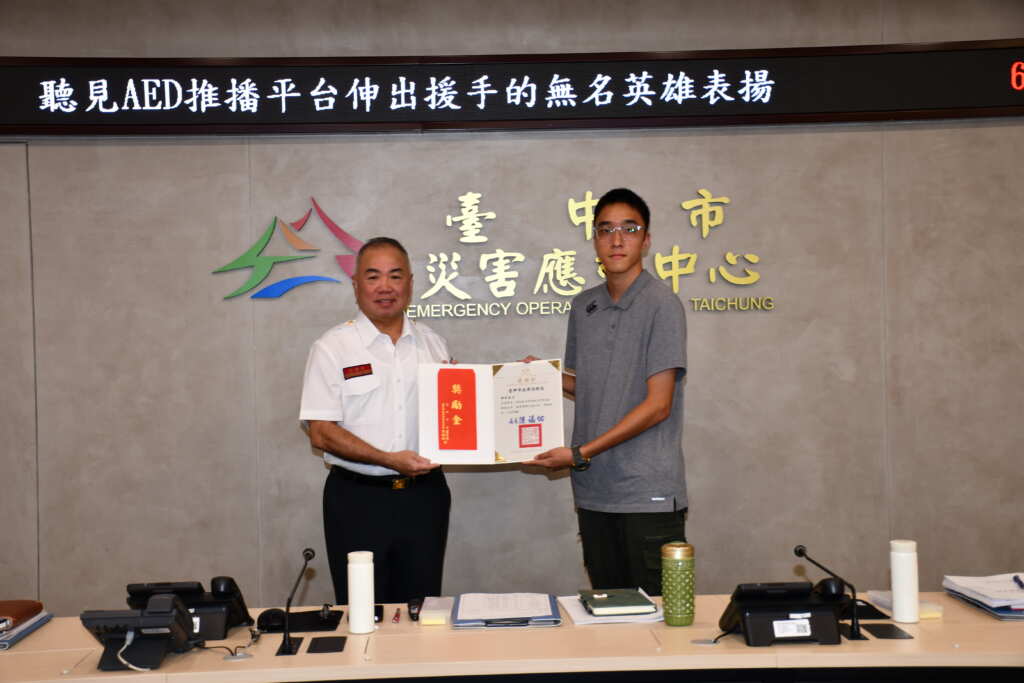 【互傳媒/記者 張學宜/台中 報導】為表揚勇於伸出援手、挽救寶貴生命的善行義舉,台中市政府消防局昨(25)日於局務會報中,由局長孫福佑親自頒發感謝狀,表揚三位使用「聽見AED」推播平台、成功參與急救行動的熱心市民──陳韋廷先生、許晉福先生及嚴師緯先生。這三位熱心市民於案發當下,即時接收到「聽見AED」平台的急救通知,並在救護人員到場前,迅速趕赴現場施行CPR及操作AED,有效爭取黃金救援時機,為患者生命點燃希望。