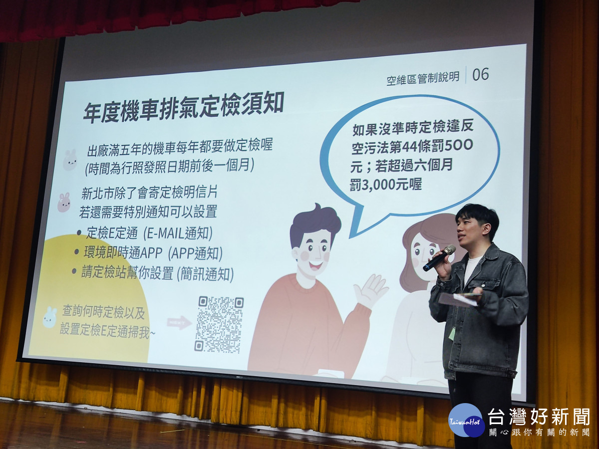 環保局強調,今年更將擴大校園宣導範圍,首度納入4所高中職學校,預計辦理8校宣導活動,目前已完成2所學校共4場次,宣導學生超過1,200人,獲得師生熱烈回響。此外,原有推動「校園環保公約」的9所學校也持續配合,截至目前,累計促成約2,300輛機車完成定檢,並透過跑馬燈、電子郵件等多元管道加強校內宣導效能。