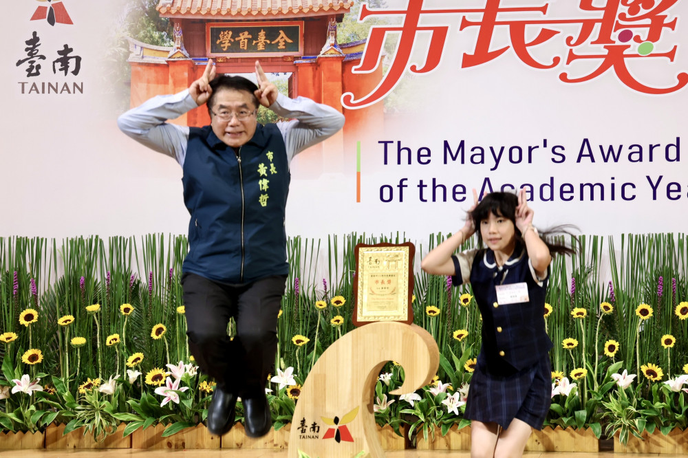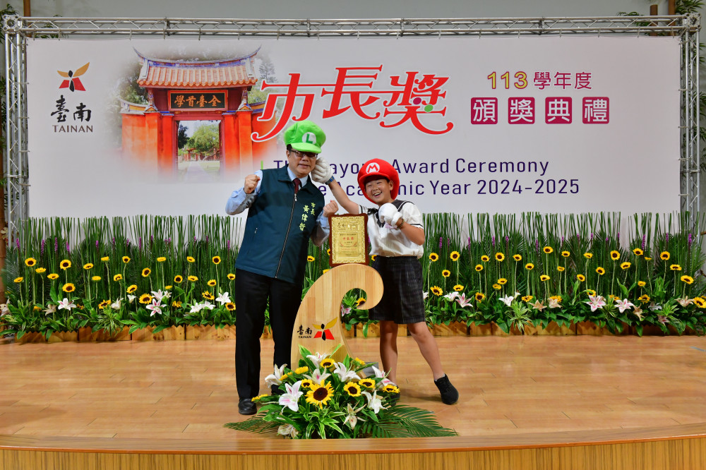 【大成報記者杜忠聰/臺南報導】由臺南首創、已邁入第4年的「市長陪你拍」市長獎頒獎典禮,最終場第6場次26日下午於慈濟高中登場,市長黃偉哲出席頒發北區、永康區、仁德區、新化區等8區共48所國小、684位榮獲市長獎的畢業生,肯定學生在各領域的優秀表現,並勉勵學子懷抱熱情與勇氣,迎向嶄新的挑戰。除了經典一字馬、公主抱外,更有人邀請市長一起學兔子跳賣萌,還有同學邀市長一起穿學士服、戴上任天堂遊戲角色「路易吉」帽子,現場上演一齣服裝秀。還有綽號「科學麵」的同學帶來一包科學麵和自製海報入鏡,效果相當吸睛。