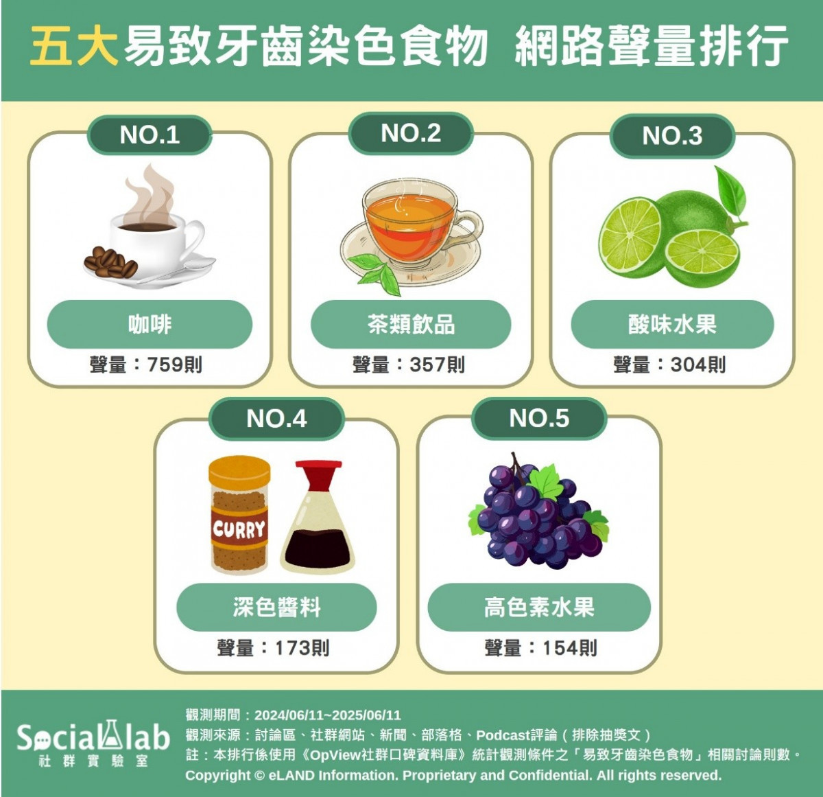 《Social Lab社群實驗室》近期透過《OpView社群口碑資料庫》追蹤近一年來「易致牙齒染色食物」相關的網路聲量,分析網友熱議的品項,揭示哪些食物容易使牙齒變色。