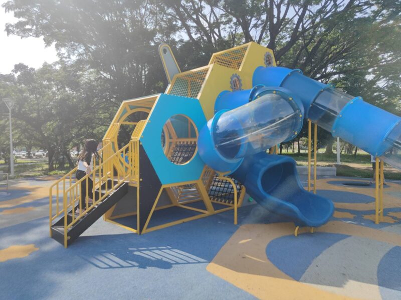楊欽富指出,岡山本洲產業園區以生產螺絲聞名,公園融合螺帽、齒輪等幾何意象圖樣,包含圓形跳跳床、齒輪蹺蹺板與多人旋轉座,並全面鋪設無縫軟墊,提升遊戲安全性。設施亦納入共融概念,設置鳥巢鞦韆、幼兒鞦韆與平板鞦韆, 滿足不同年齡與身心需求孩童使用。另規劃成人健身器材區,提供居民全齡活動空間。