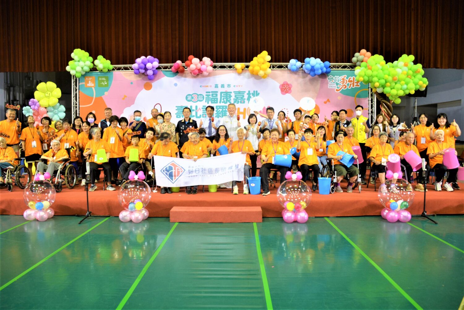 〔焦點時報/記者郭政隆嘉義市報導〕家有一老,如有一寶!為期待長輩有福氣、平安又健康,猶如諸羅城一樣長壽,嘉義市長期照顧管理中心7/4日於港坪運動公園體育館辦理第3屆「福康嘉桃 壽比諸羅SHOW」活動,現場有17家日照中心、計230位長輩出席參與,並由日照中心長輩組成的「好日千歲打擊樂團」為活動揭開序幕,展現不老活力,且今年小橘子非營利幼兒園的小朋友也站在舞台上一齊同樂,秀出最可愛活潑的模樣,展現世代共融的幸福嘉義市。