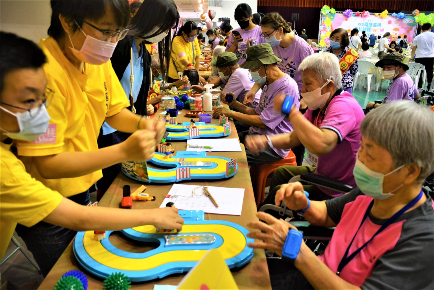 這次活動專門為日照中心的長輩辦理,共有5家日照中心的長輩,在舞台上盡情展現活力,透過耳熟能詳的廣告歌曲旋律「天天年輕」,以及紅遍大街小巷的「如果你是我的花朵」、「保庇」等歌曲,帶動熱鬧氣氛外,現場也有12闖關活動攤位同步進行,讓長輩、小朋友及學生一齊同樂,實現世代共融的目標。