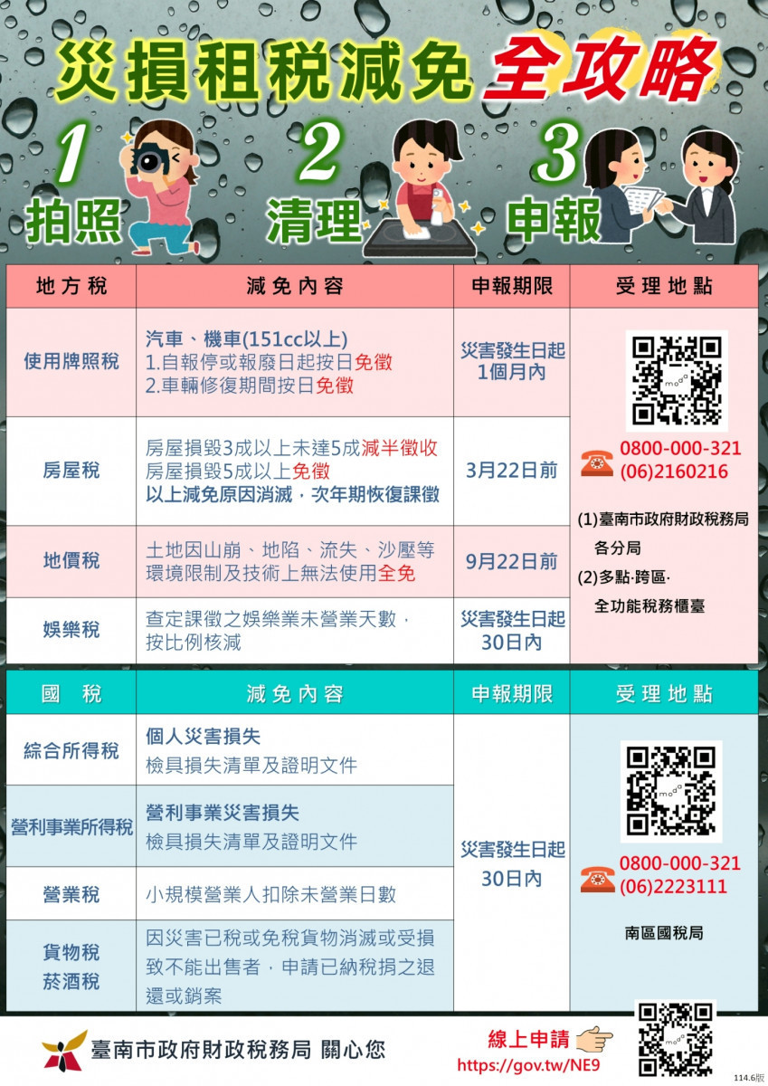 財稅局提醒,災損減免申請可多利用財政部稅務入口網(https://www.etax.nat.gov.tw/)線上申辦,免外出奔波,也可郵寄或就近至該局所屬分局及6處「多點.跨區.全功能稅務櫃臺」辦理。另外個人或營利事業財物因災害損毀涉及所得稅、營業稅、貨物稅或菸酒稅的減免,可透過上述網址向國稅稽徵機關申請減免。如有任何疑問,歡迎在上班時間撥打0800-000-321免費服務電話,將有專人竭誠為您服務。