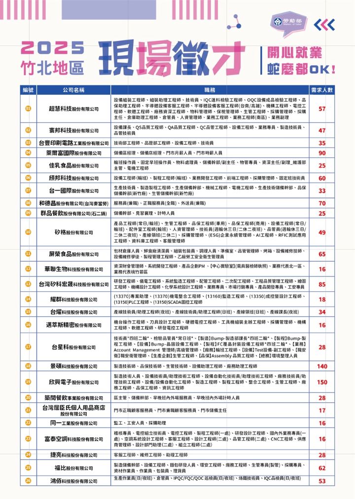 【記者 彭慧婉/新竹 報導】勞動部勞動力發展署桃竹苗分署將於7月11日下午1點30分至4點,於竹北中興里集會所二樓 (新竹縣竹北市嘉豐南路一段11號)辦理「2025年竹北地區現場徵才活動」,本場活動集結欣興電子、矽格、景碩科技、台燿科技、頎邦科技、超慧科技、鴻佰科技、台豐印刷電路、築間餐飲、萊爾富、屈臣氏、富泰空調、台一國際、同一工業等共計26家知名廠商,現場提供高達1,263個優質職缺,歡迎求職民眾與應屆畢業生踴躍參加。